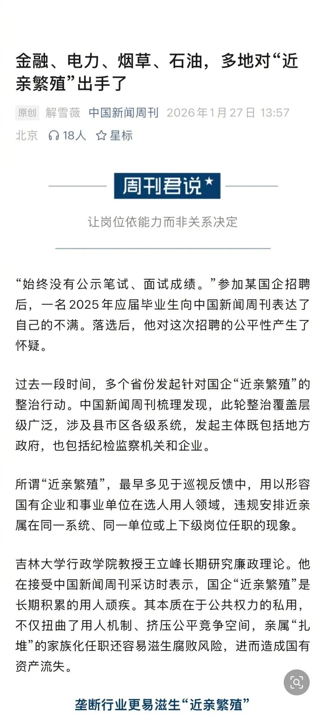 当然,“近亲繁殖”现象主要集中在烟草、金融、电网等垄断行业和领域。一些市场化程度较高的央国企,用人更强调效率和资源匹配。二级公司一般拥有一定招聘自主权吸纳人才,其中不乏亲友或同学推荐,只要履行规范的笔面试程序、具备相应能力或业务资源,不宜简单定性为廉洁问题。